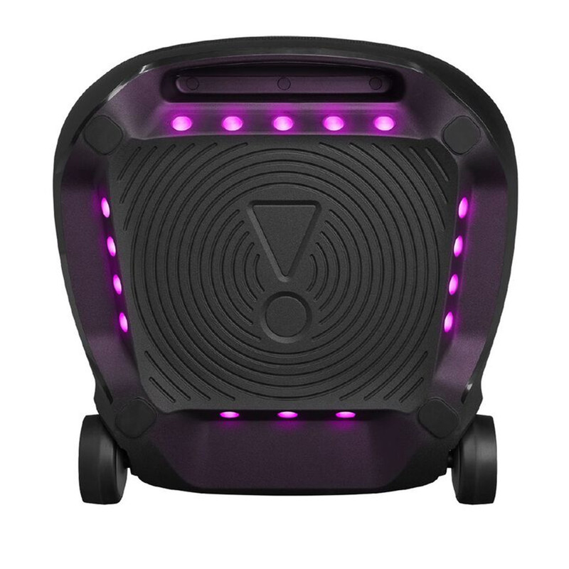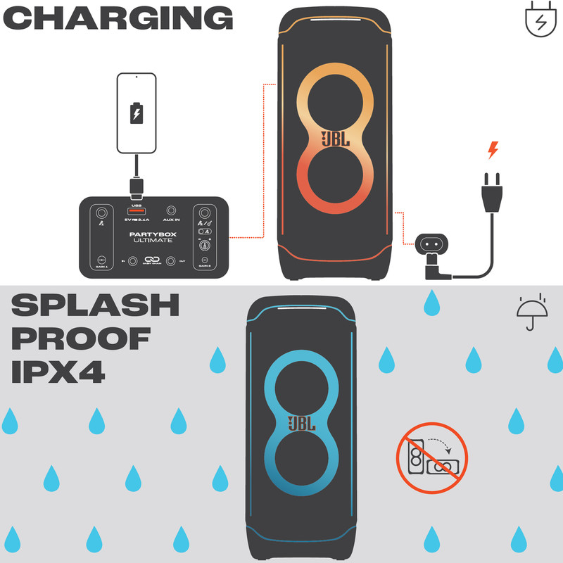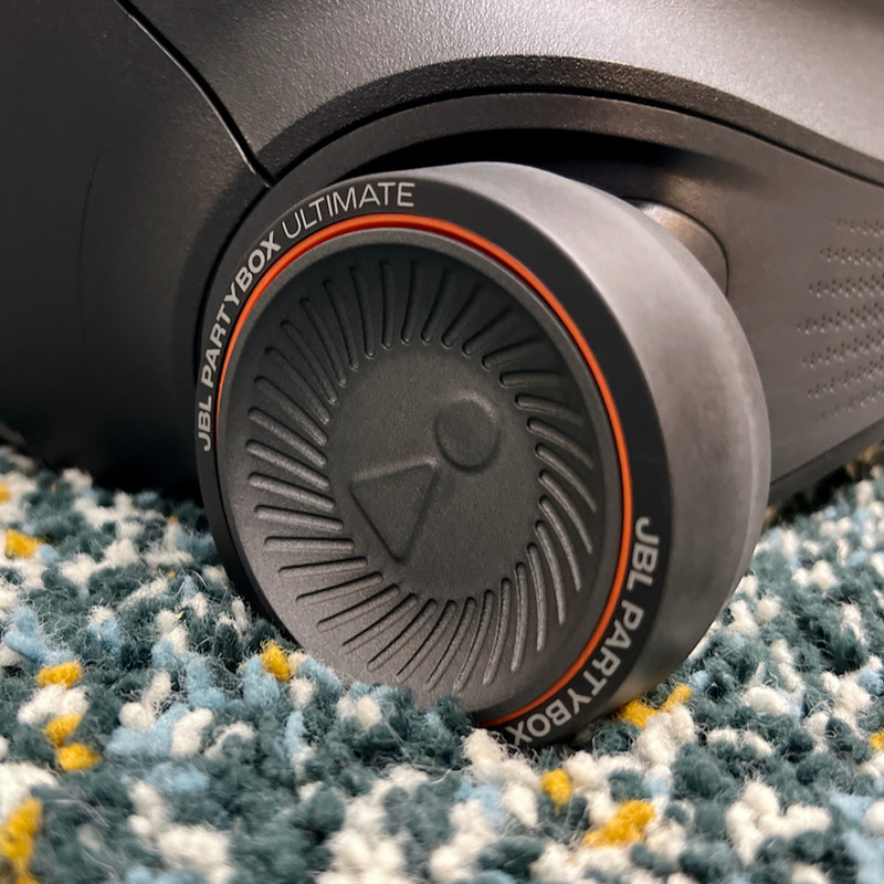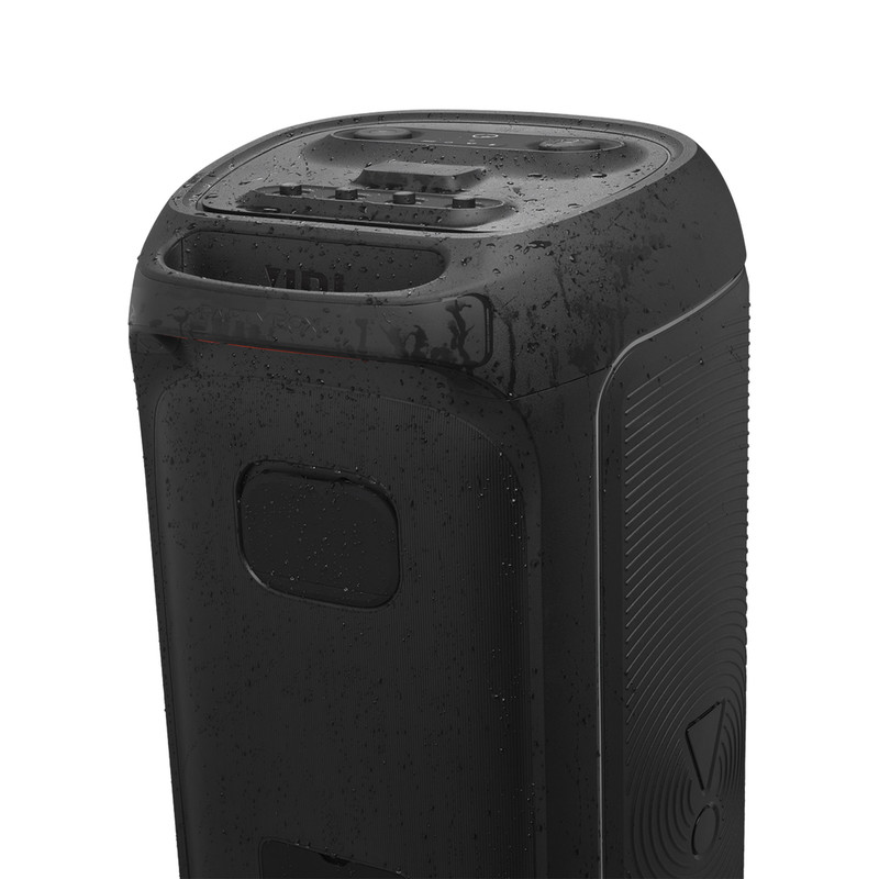 PartyBox Ultimate با ابعاد ۴۵۵ در ۱۰۴۹ در ۴۴۰ میلیمتر و وزن قابل توجه ۳۹.۵ کیلوگرم، حضوری قدرتمند و مسلط دارد. بدنهی این اسپیکر از پلاستیک فشرده و بسیار مقاوم ساخته شده که دوام بالایی را در برابر شور و هیجان مهمانیها و جابجاییهای متعدد تضمین میکند. با وجود این ابعاد و وزن، جیبیال با هوشمندی، یک دستگیرهی ارگونومیک و بسیار محکم، به همراه چرخهایی روان و تقویتشده در قسمت پایینی دستگاه تعبیه کرده است. این ترکیب، جابجایی این غول صوتی را به طرز شگفتآوری آسان و بیدردسر میکند و به شما اجازه میدهد تا صحنهی اجرای خود را به هر مکانی، از داخل خانه گرفته تا فضای باز، منتقل کنید. این اسپیکر همچنین دارای گواهینامهی IPX4 است که مقاومت آن را در برابر پاشش آب از هر جهتی تضمین میکند. این ویژگی، خیالی آسوده را برای استفاده از آن در کنار استخر، مهمانیهای ساحلی یا حتی در شرایط آب و هوایی غیرمنتظره فراهم میکند و به شما اجازه میدهد تا بدون نگرانی، از موسیقی و جشن خود لذت ببرید.