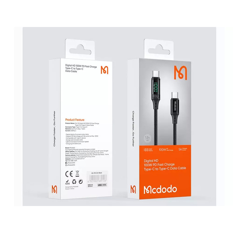 کابل USB-C مک دودو مدل Digital HD 100W PD Fast Charge طول 1.2 متر دارای روکش کنفی مقاوم و شکیل میباشد.این کابل دارای نشانگر دیجیتال میزان خروجی توان برق است که کاربر را در هر زمان متوجه توان شارژ میکند.کابل مک دودو دارای توان 100Wو حداکثر تا 5 آمپر جریان را دارد که می تواند از همه دستگاهها با توان و جریان پایین تر نیز بخاطر چیپ هوشمند مک دودو پشتیبانی نماید.کابل نایلونی بافته شده قوی و بادوام با بدنه شیلد آلیاژ آلومینیوم با کیفیت بالا، کابلی با کلاس بالا به ارمغان می آورد.این کابل علاوه بر شارژ انتقال دیتا با نرخ 480 مگابیت بر ثانیه را نیز انجام میدهد.