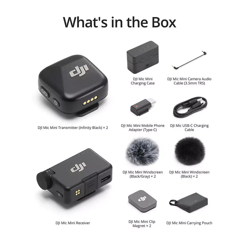 | اقلام همراه | یک عدد گیرنده میکروفون DJI. دو عدد فرستنده میکروفون DJI. کیس شارژ میکروفون DJI. کابل صوتی دوربین میکروفون DJI (3.5 میلی متر TRS). آداپتور تلفن قابل تعویض میکروفون DJI (USB-C). 4 عدد خز باد گیر. دو عدد مگنت گیره DJI. کیسه حمل DJI. کابل شارژ DJI |