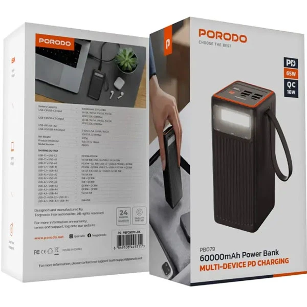 شارژر همراه پورودو با ظرفیت 60000 میلیآمپر ساعت و قابلیت شارژ PD برای چندین دستگاه، یک راهحل شارژ متنوع و با ظرفیت بالا برای تغذیه تمامی دستگاههای شما میباشد. با داشتن ظرفیت چشمگیر 60000 میلیآمپر ساعت (3.7 ولت 222 وات ساعت)، این دستگاه پشتیبانی خوبی برای گوشیهای هوشمند، لپتاپها یا هر دستگاه دیگری ارائه میدهد. این محصول با سرعت بسیار بالا از طریق USB-C1/USB-C2 ورودی و خروجی شارژ را انجام میدهد و حداکثر 65 وات را با سازگاری PD 65W پشتیبانی میکند؛ خروجی USB-A1/USB-A2 نیز برای حداکثر 225 وات در دسترس است که به این ترتیب امکان شارژ چندین دستگاه بهطور همزمان را فراهم میآورد. سیستم خروجی مشترک به چند دستگاه اجازه میدهد تا بهطور همزمان در ترکیبهای PD30W و QC18W شارژ شوند. شارژ لپتاپ به همراه مدیریت هوشمند توان مصرفی، مصرف موثر انرژی را تضمین میکند. این پاوربانک یک مرکز قدرت قابل اعتماد با عملکرد و راحتی بهبود یافته است که بهطور کامل برای مسافران، کارمندان دورکار یا هر کسی که به یک منبع انرژی قوی در حین حرکت نیاز دارد، مناسب است.